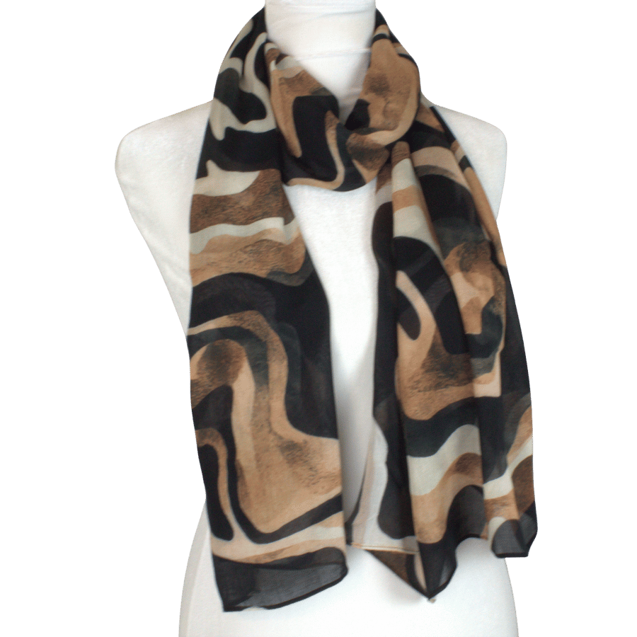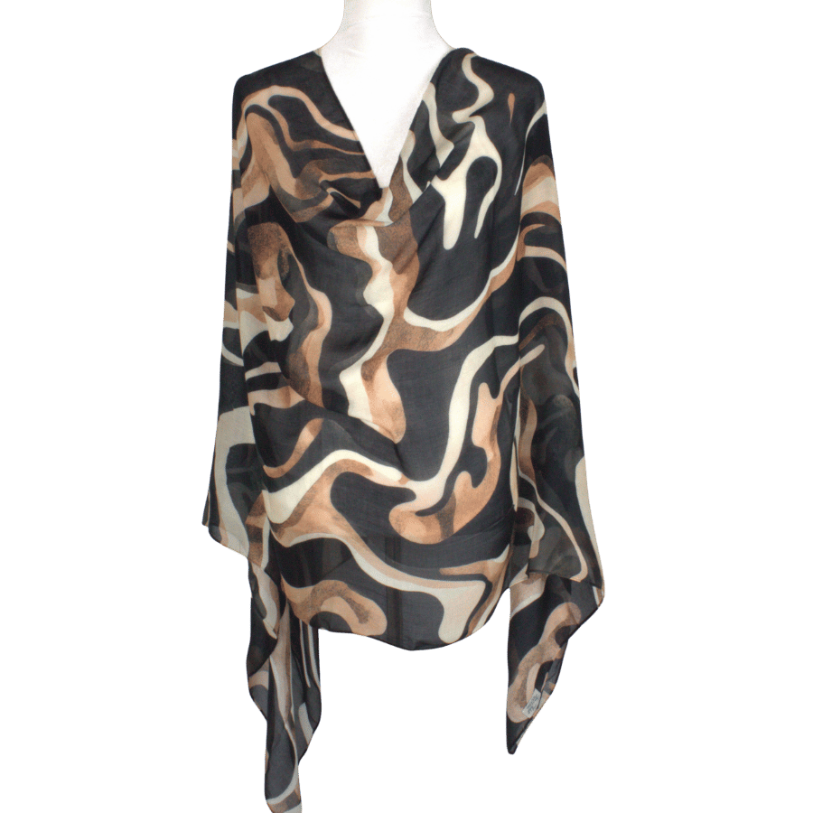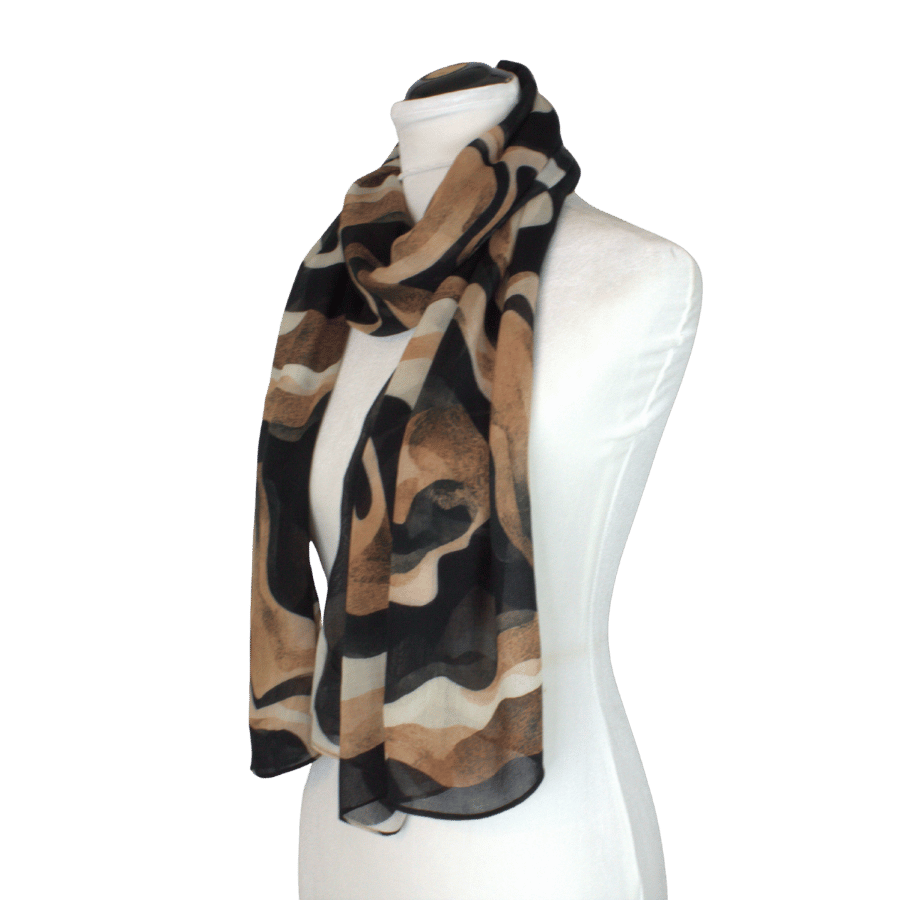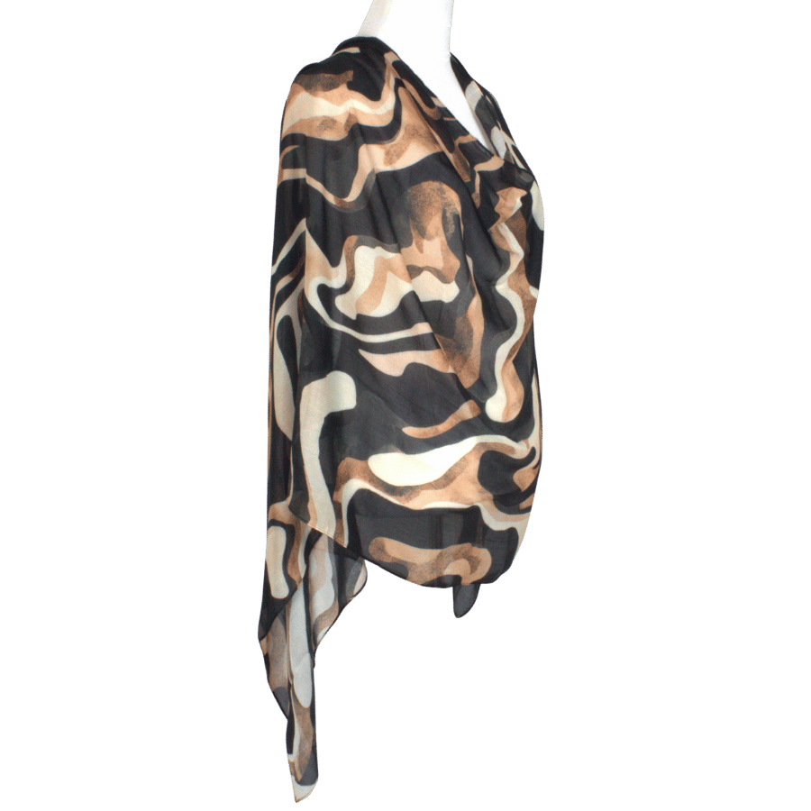 Pair Bronzed Strokes with a crisp cream blouse and tailored mocha trousers for a professional look. Transition to evening by swapping in bronze jewelry and a sleek black satin clutch — the brush‑stroke print ties the two colour stories together seamlessly.