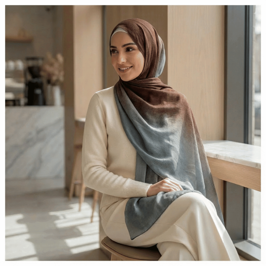 Elevate your wardrobe with Elaris Ombré, a premium bamboo modal hijab designed for professional and elegant hijabi women. This exclusive design flows in a graceful gradient from deep teal to rich chocolate brown, offering versatile styling for every occasion.
