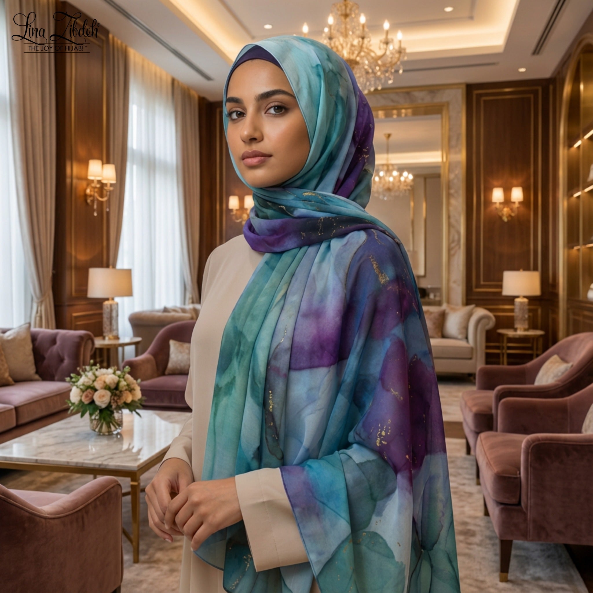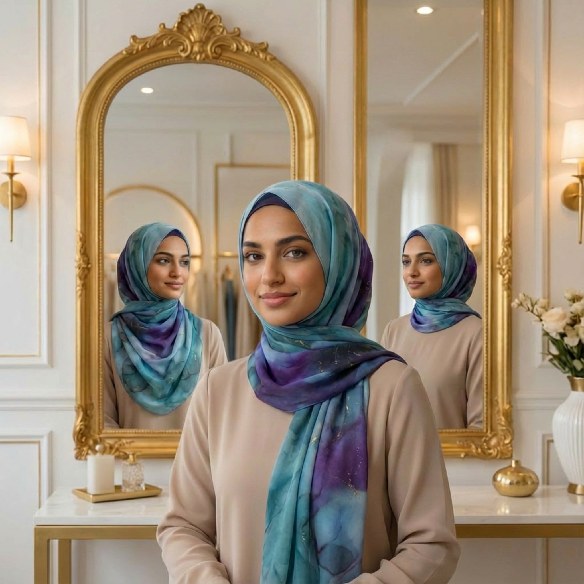 A textured chiffon hijab featuring a jewel-tone watercolor marbled print with violet, teal, emerald, navy, and soft gold accents. Our signature textured weave offers a better natural grip, elegant drape, and a refined matte-sheen finish. Versatile, elevated, and made for repeat wear.