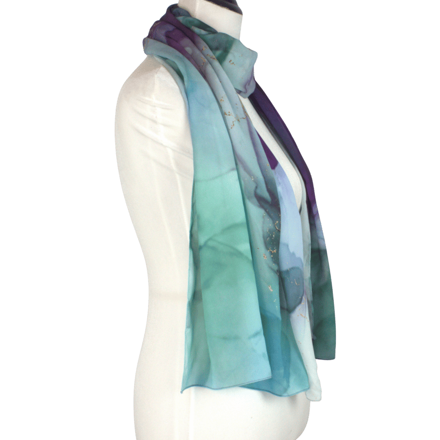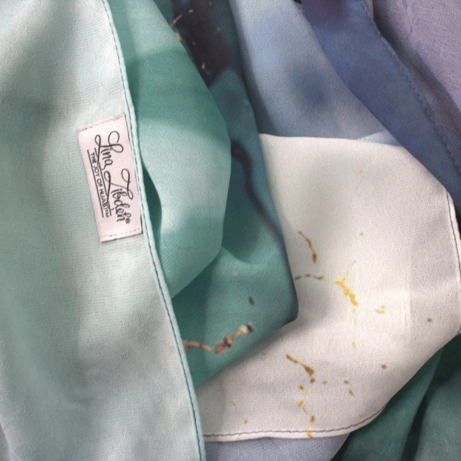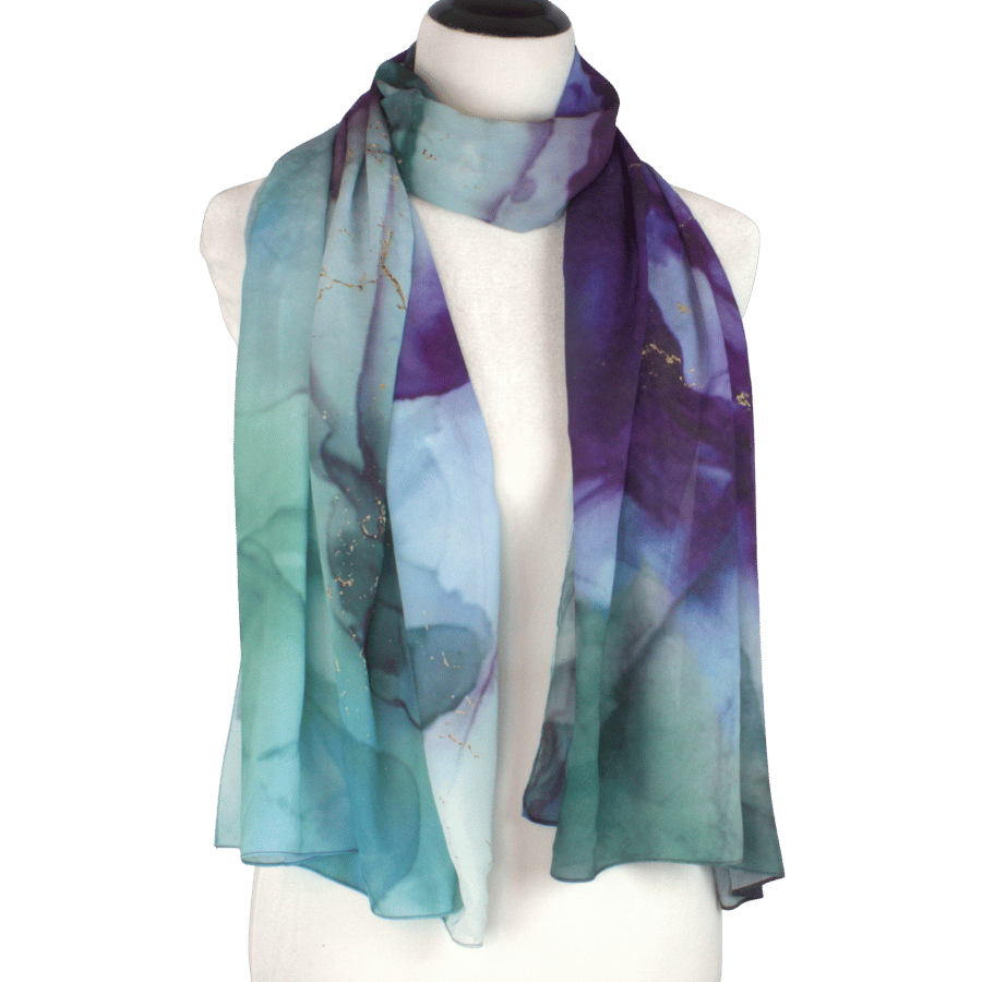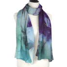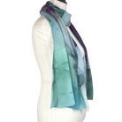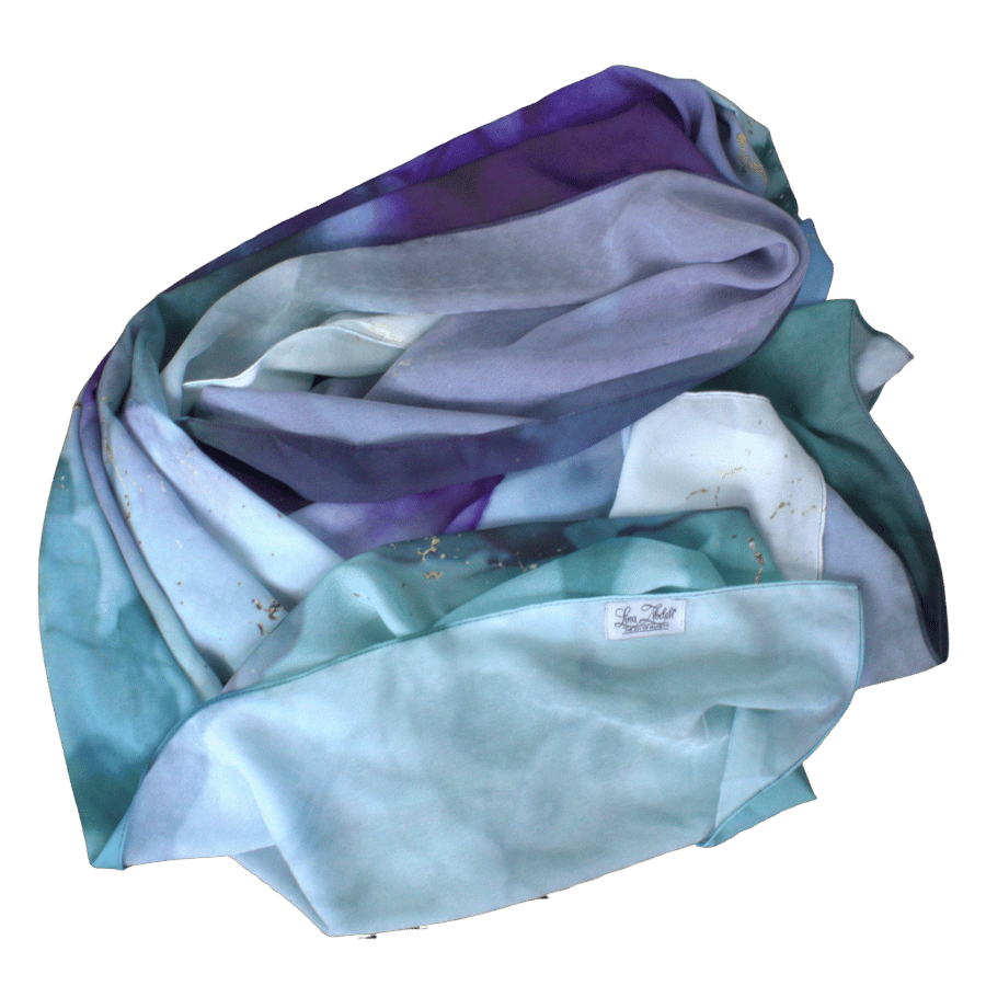 Jewel Reverie brings to life a watercolor-marbled fusion of jewel tones: deep and soft violet, teal, emerald, navy, and gentle touches of gold. Each border highlights a different blend of color, giving you a scarf with true dimension — a piece you can style in countless ways and pair effortlessly with a wide range of outfits.