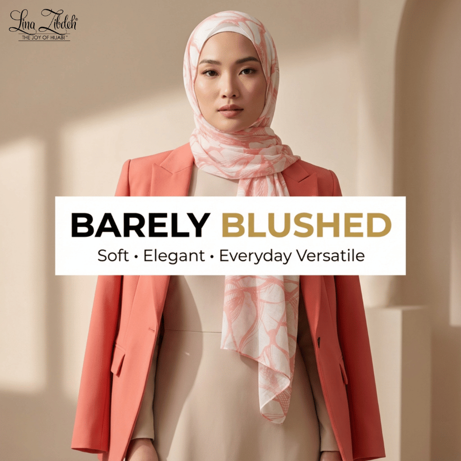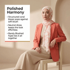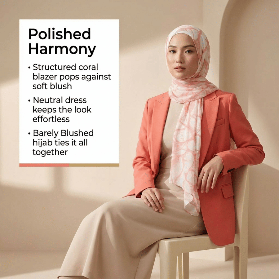 Pair your beige dress and coral jacket with Barely Blushed for a harmonized look where the blush coral in the hijab softly echoes your jacket while the soft white brightens your face. Keep accessories minimal—gold or rose gold jewelry will enhance the warmth.