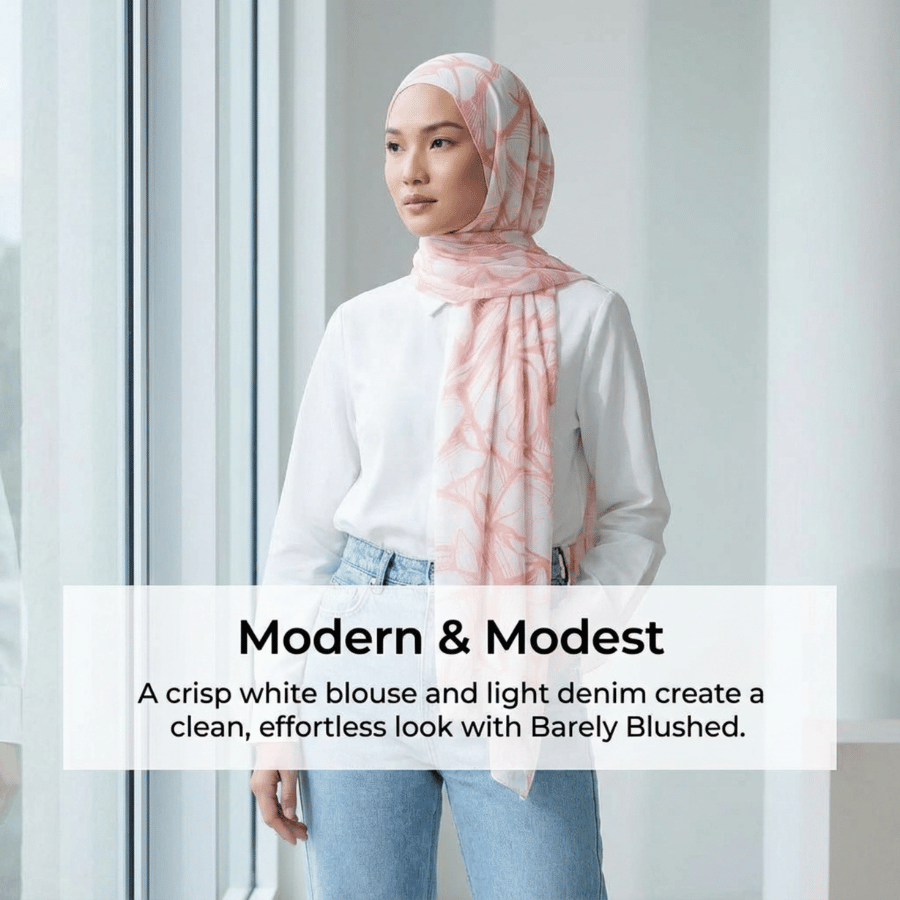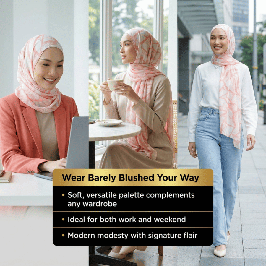 Subtle yet striking, Barely Blushed brings together the soft glow of blush coral with the freshness of soft white, creating an airy and elegant blend that flatters every skin tone. Crafted from our premium bamboo modal fabric, this hijab feels weightless, breathable, and effortlessly drapes without slipping — perfect for all-day comfort. Whether you're dressing for work, a special gathering, or a simple day out, Barely Blushed adds just the right hint of color while maintaining a polished, refined look.